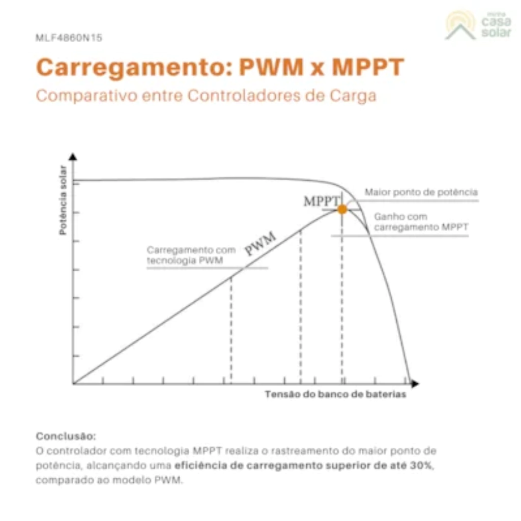 O Controlador MPPT reduz a tensão do arranjo fotovoltaico e aumenta a corrente de carga das baterias. Essa tecnologia permite ampla compatibilidade com placas solares de médio e grande porte, independentemente da tensão, como modelos de 280W, 330W, 450W, 550W, 585W, 650W e 700W. A única limitação é que o arranjo série/paralelo de módulos não pode ultrapassar tensão de 150Vcc e a corrente de 60A.