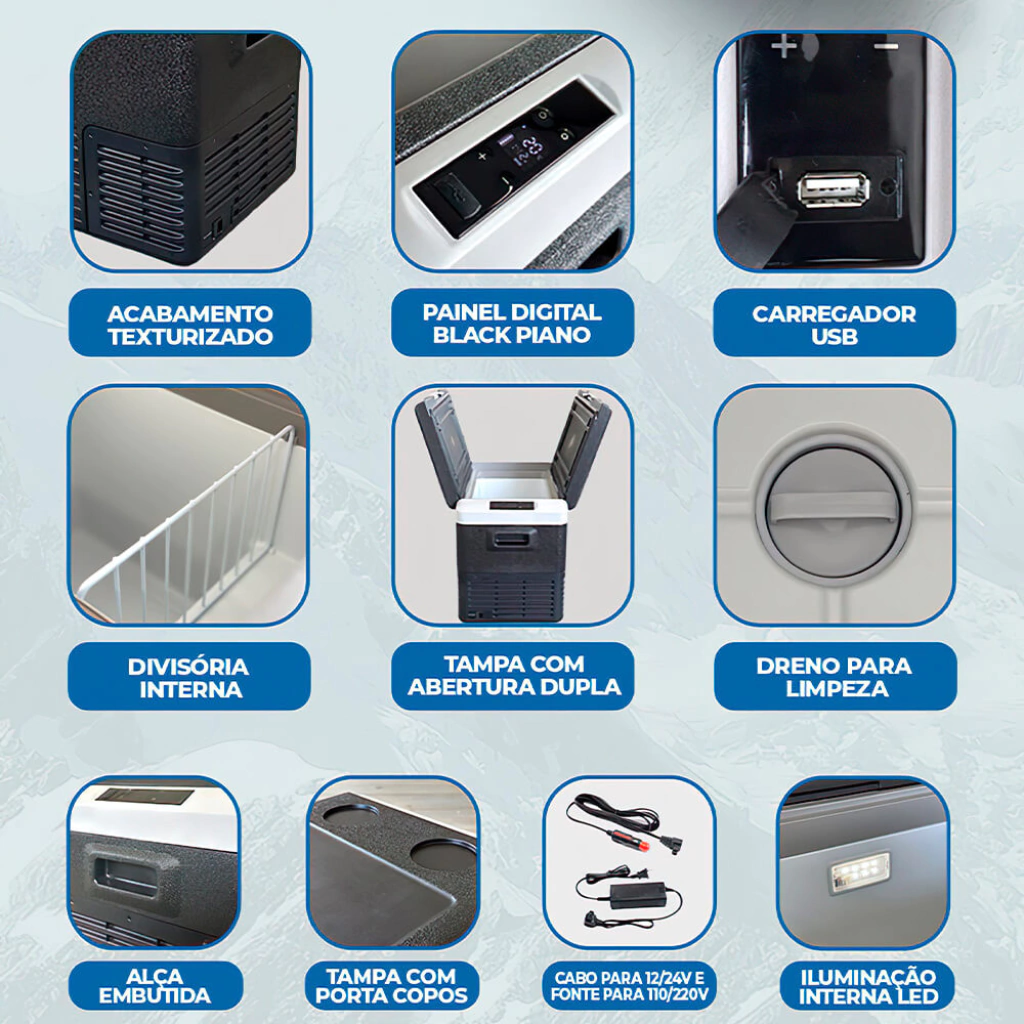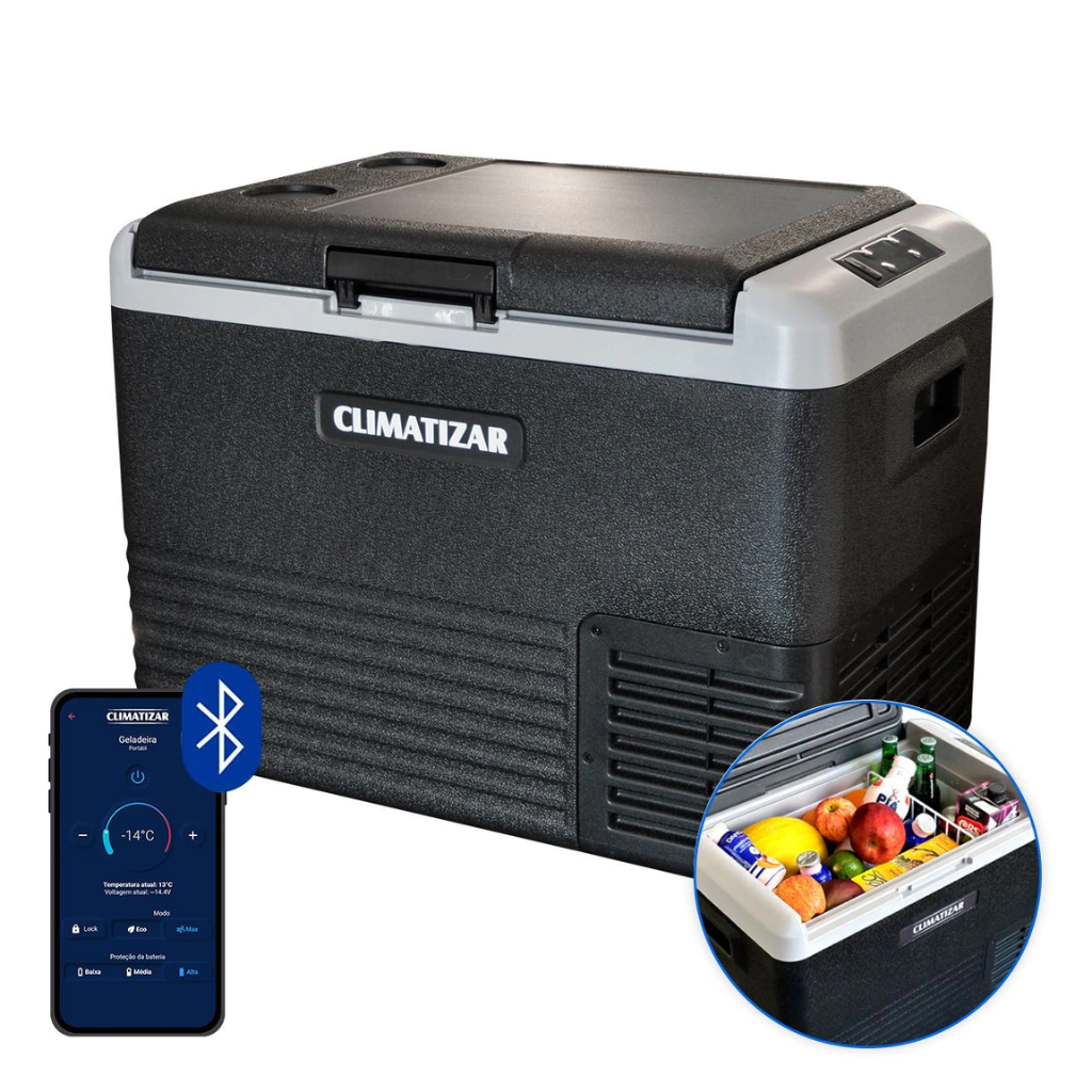 Geladeira Portátil Climatizar Quadrivolt 12v 24v 110v e 220v. Capacidade de 40 Litros, com conectividade Bluetooth e Garantia de Fábrica! Refrigere a sua jornada!