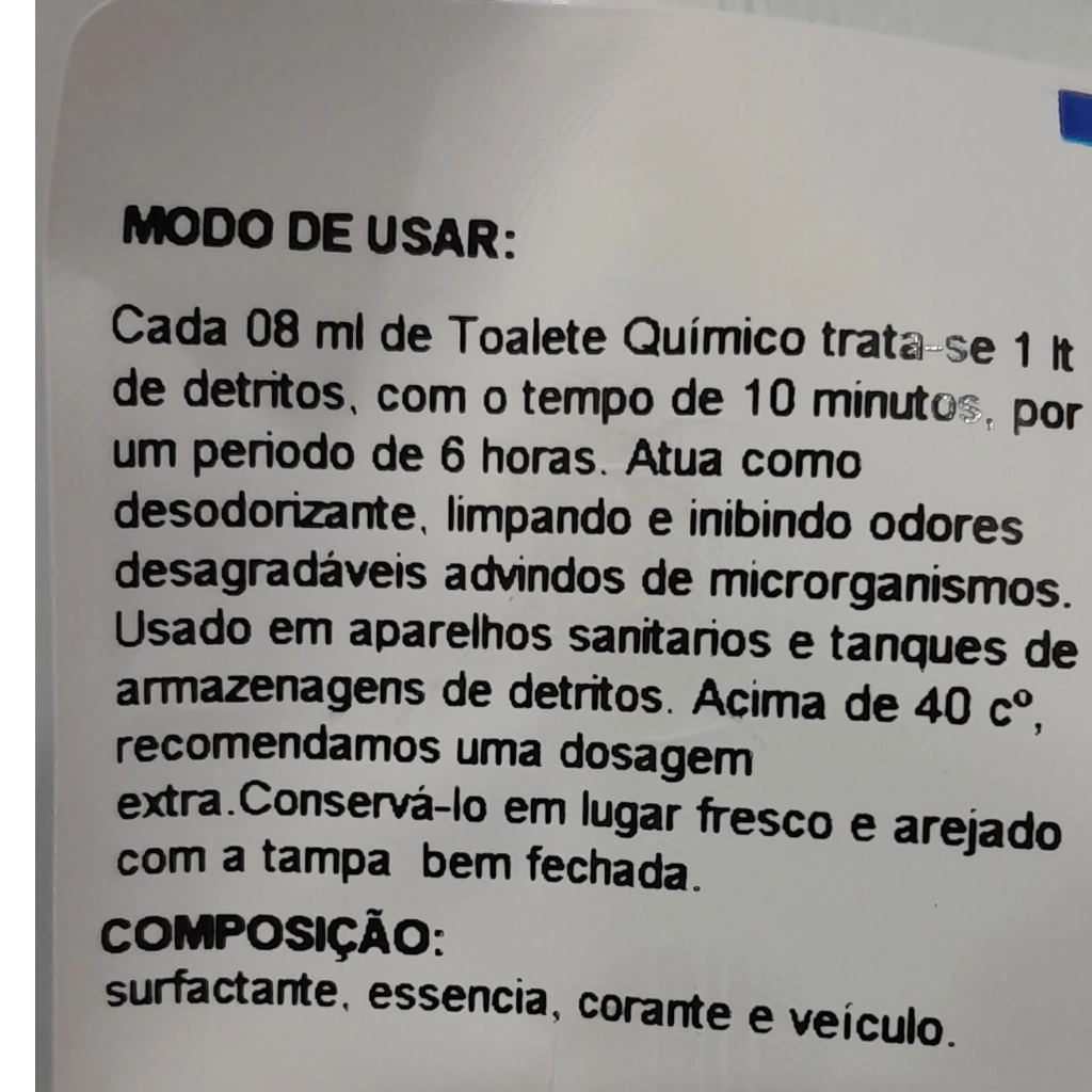 Cada 08 ml de Toalet Químico trata 1 lt de detritos, com o tempo de 10 minutos, por um periodo de 6 horas.